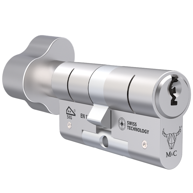 De Matrix** is tweezijdig bedienbaar, wat betekent dat als er aan de binnenkant van de deur een sleutel zit, het mogelijk blijft om de sleutel vanaf de buitenzijde te gebruiken. Deze functie is standaard bij alle M&C cilinders en is een vereiste bij de meeste smartlocks.